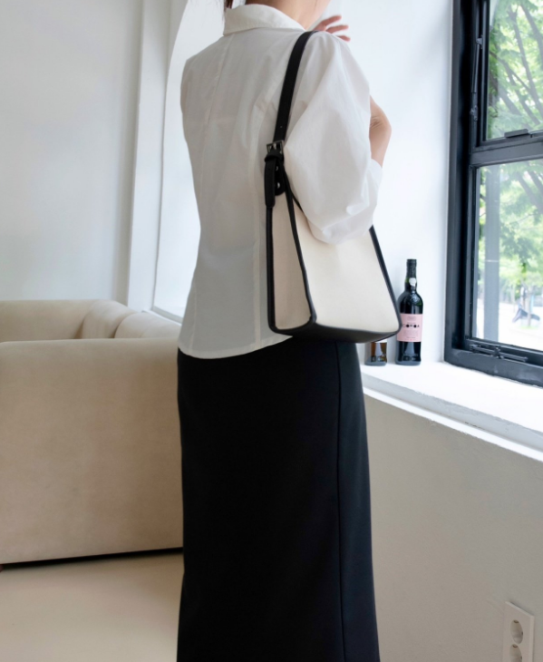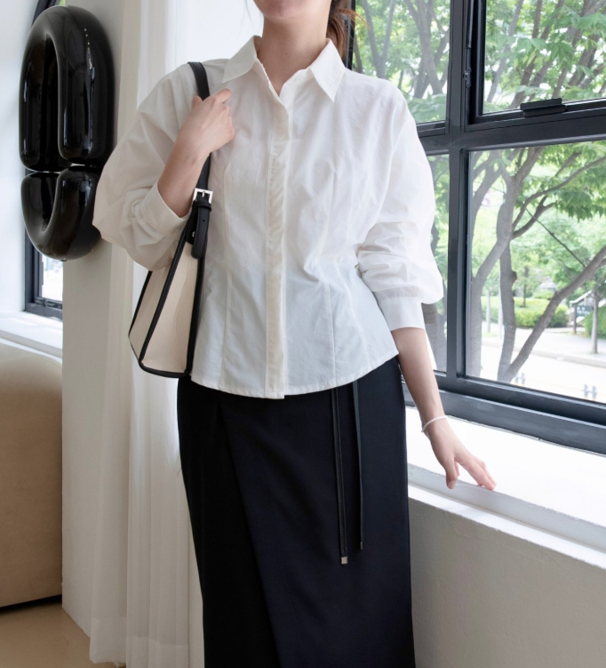 나일론과 코튼 혼방의 바스락한 원단이예요 구김도 잘 안가고 약간의 광택감으로 고급미가 느껴져요. 히든 단작에 허리에 다트와 절개로 특별한 연출없이도 날씬해 보이는 핏 소매는 한판 소매로 여유있고 볼륨감 지는 느낌이 우아해요 라인이 많이 들어가 있어서 날씬해 보이지만 사이즈 너무 타이트 하지 않아서 정77까지 가능 길이감은 꺼내서 입기도 너무 좋고 슬랙스나 스커트 안에 넣어 입기도 좋아요. 한 여름 빼고는 데일리 아이템으로 강추!