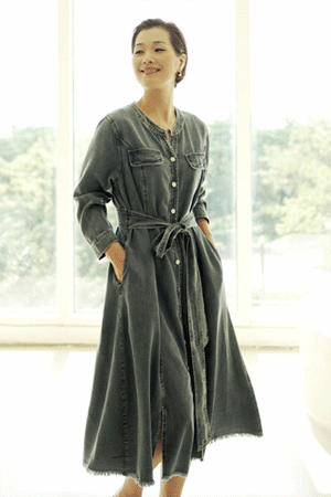 B22_BOP201 투톤스티치 슬릿 데님 원피스
