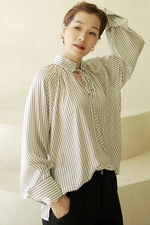 B22_BBL230 스트라이프 볼륨소매 새틴 블라우스