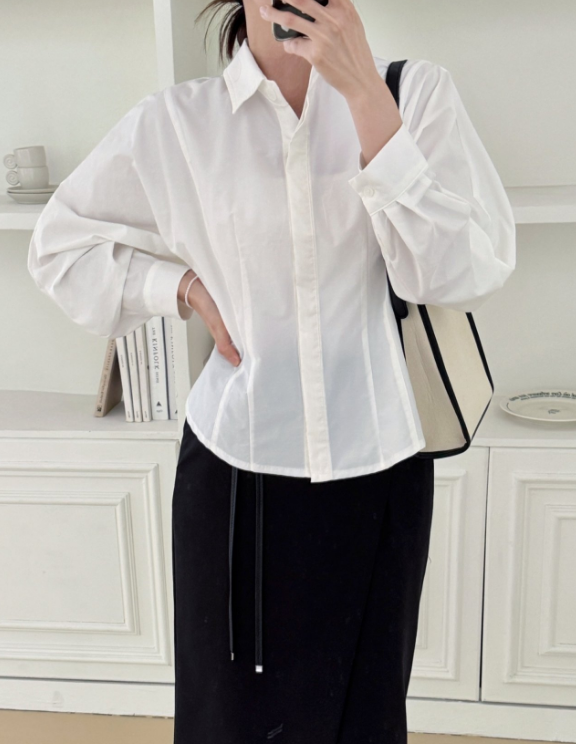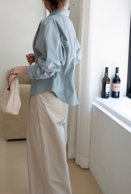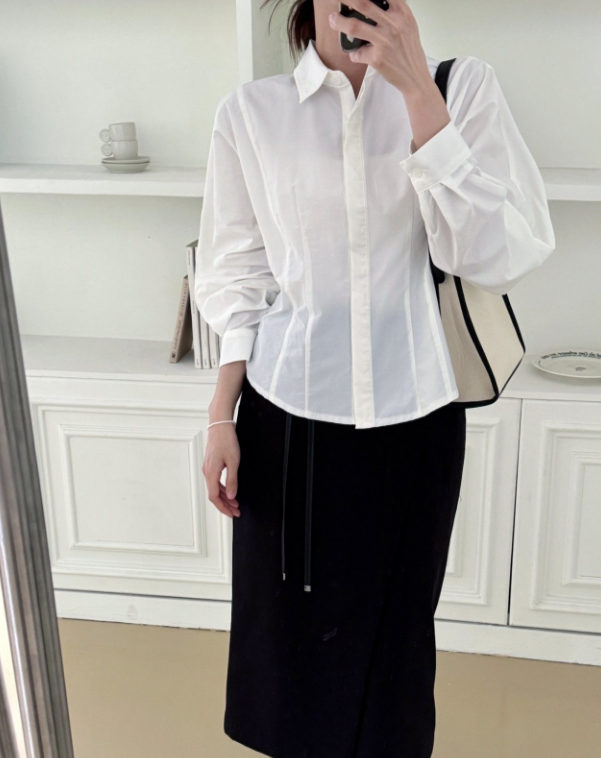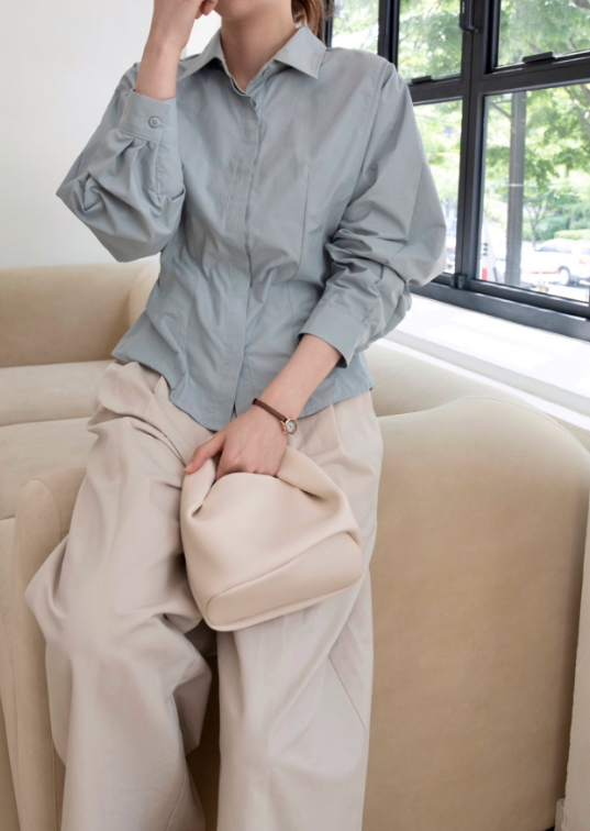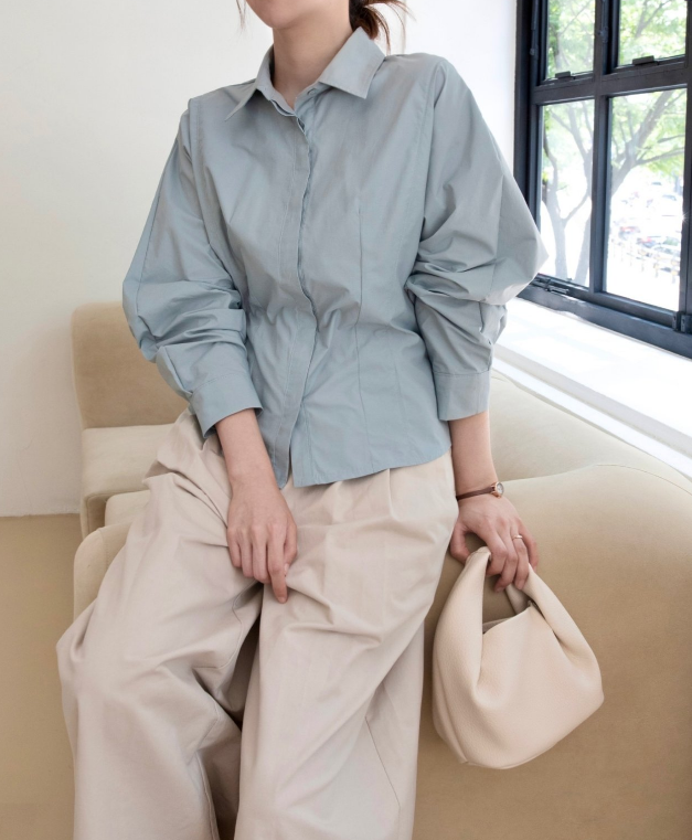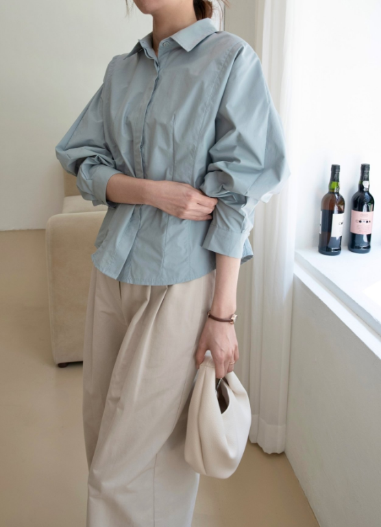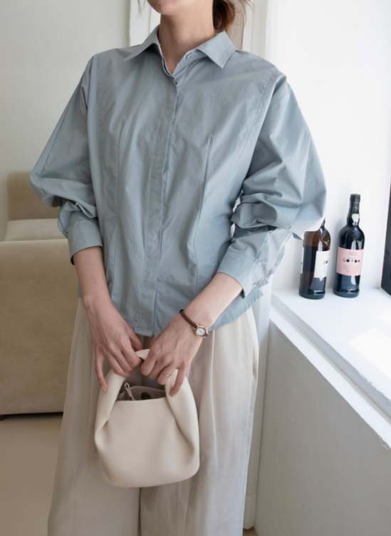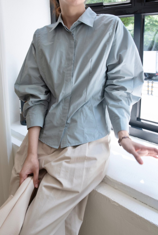 나일론과 코튼 혼방의 바스락한 원단이예요 구김도 잘 안가고 약간의 광택감으로 고급미가 느껴져요. 히든 단작에 허리에 다트와 절개로 특별한 연출없이도 날씬해 보이는 핏 소매는 한판 소매로 여유있고 볼륨감 지는 느낌이 우아해요 라인이 많이 들어가 있어서 날씬해 보이지만 사이즈 너무 타이트 하지 않아서 정77까지 가능 길이감은 꺼내서 입기도 너무 좋고 슬랙스나 스커트 안에 넣어 입기도 좋아요. 한 여름 빼고는 데일리 아이템으로 강추!